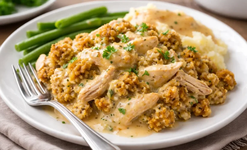 Instead of preparing traditional dumplings from scratch, this version uses refrigerated biscuit dough sliced into thin strips. As the biscuits cook in the crock pot, they puff up into soft, pillowy dumplings while naturally thickening the creamy sauce. The result is a warm, satisfying meal with tender chicken and fluffy dumplings in every bite.